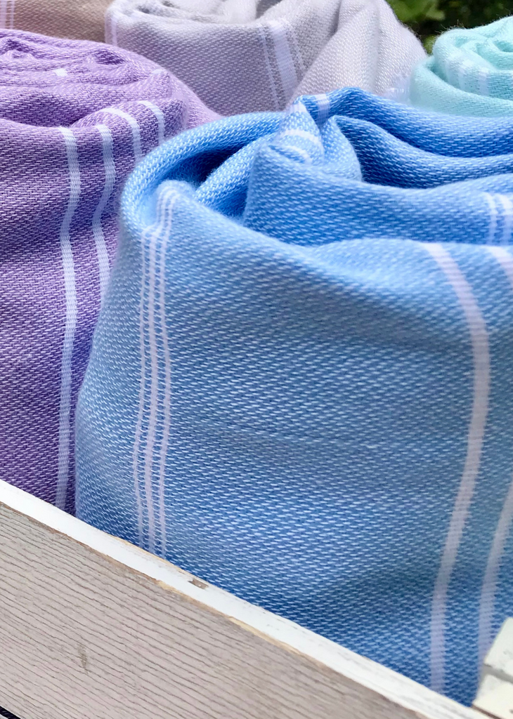 Dream of a cloudless, holiday sky with our blue skies hammam towel. A cool, refreshing hue to remind you of holidays gone by whilst looking forward to the next! Just one of the many uses for this versatile turkish towel.