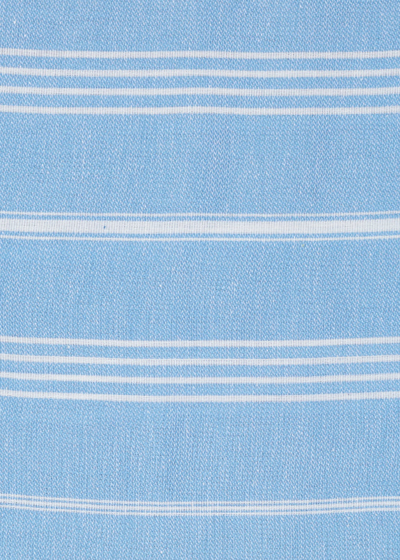 Quick-drying holiday Turkish travel towel in a light Sky Blue, featuring decorative white stripe pattern and hand-tied tassels.